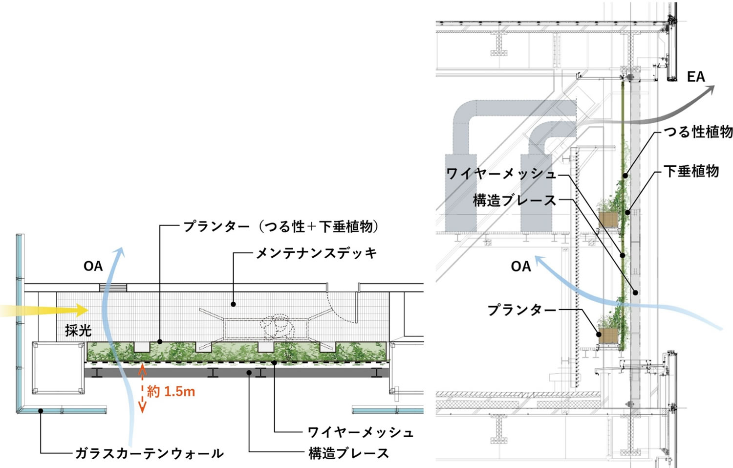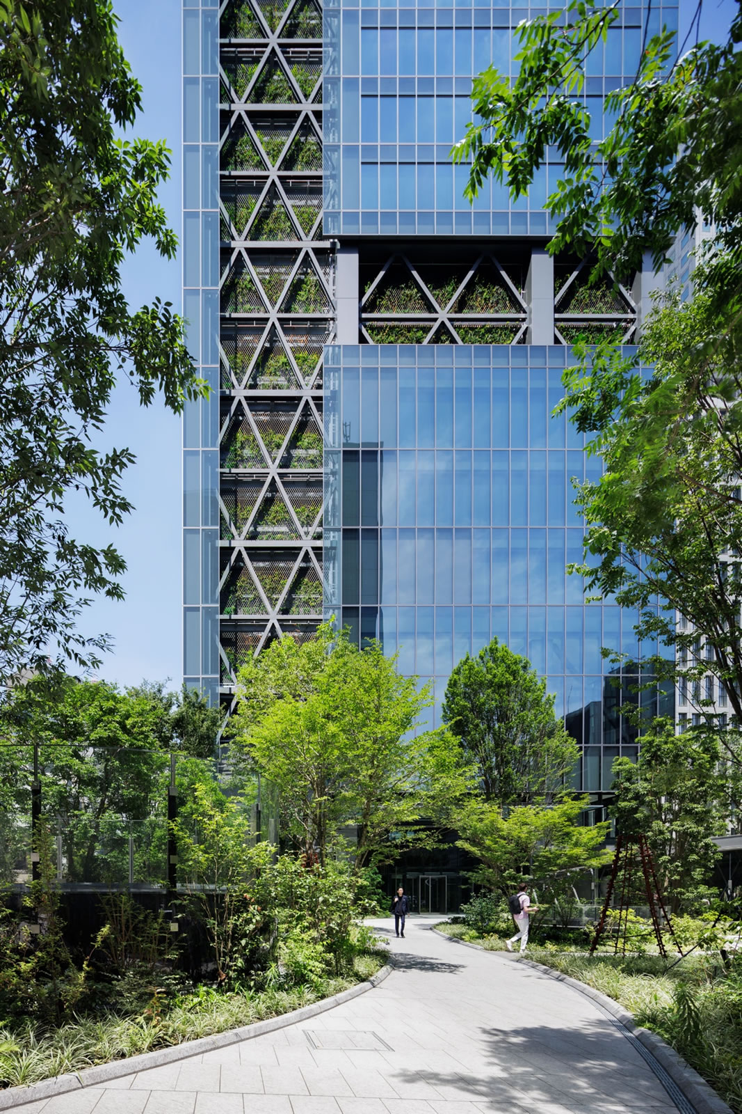 極細の構造ブレースを意匠的に構築し、その間隙を活かして建物の吸排気機能を内包。この構成に壁面緑化を組み込むことで、植物のレイヤーを通した新鮮な空気を内部に取り込み、街に対しては、輻射熱を抑制しつつ、多様性のある植栽構成で、表情豊かなファサードを生み出した。壁面緑化は、ガラスカーテンウォールの外壁面から約1.5m内側に設定し、側面を塞ぎつつ、ガラス越しに採光を確保することで、良好な生育環境を実現した。