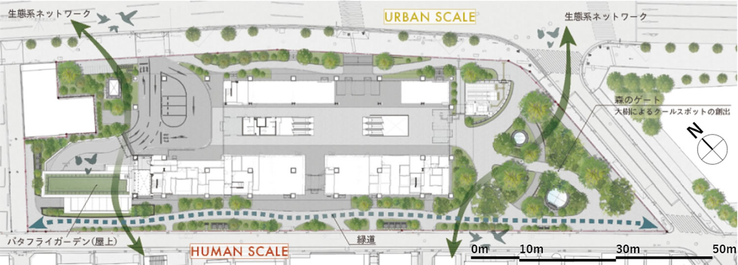 かつての溜池の水と緑が担っていた生態系ネットワーク・温熱環境調節機能を取り戻すべく、地上に加えて、屋上と壁面に多様性を包含した緑の大きなボリュームをつくり出すことテーマとした。