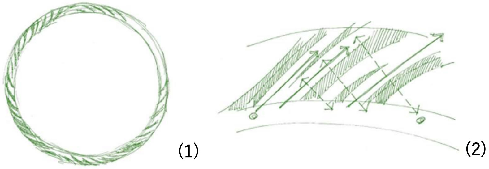 1周約2kmのリングを大きな時計に見立て、咲く花によって四季を体感できる風景を創出。大スケール(1)では、大きくうねる流れのある空間構造で、四季折々の彩りをダイナミックに表現。中スケール(2)では、植栽密度がグラデーションで変化する緑の構成で、屋上を回遊する人の視点変化に伴い、緑の表情も変化。ヒューマンスケール(3、4)では、草花がひとつひとつ細やかに咲いている楽しさを演出し、植物の高さと重なりによって奥行きのある立体的な表情をもたせた。