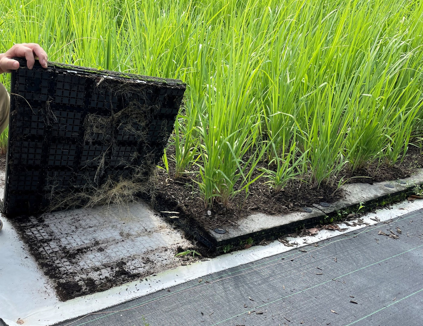 リングは「つくりやすく、解体・リユースしやすい」ものとするため、植栽基盤の91.6%がリサイクル材で構成された薄層、軽量なユニット植栽基盤を採用。傾斜面に設置するチガヤマットは、管理の厳しい現地養生期間を減らすため、事前養生を行い、薄層緑化基盤に定着した状態で現地搬入を行う新たな施工フローを導入した。