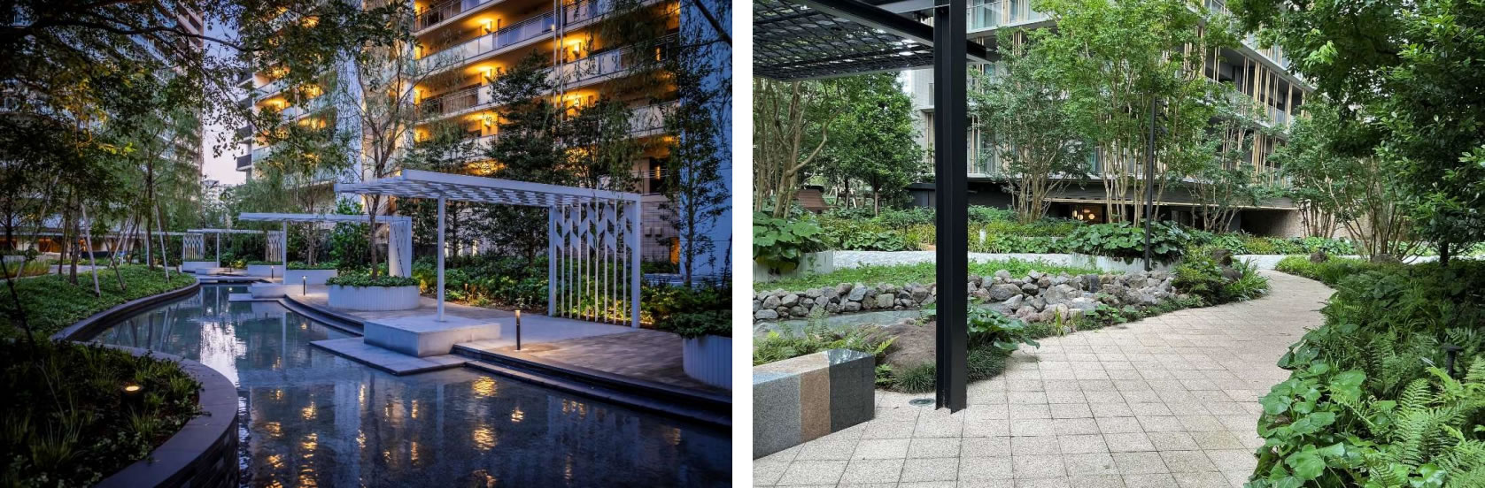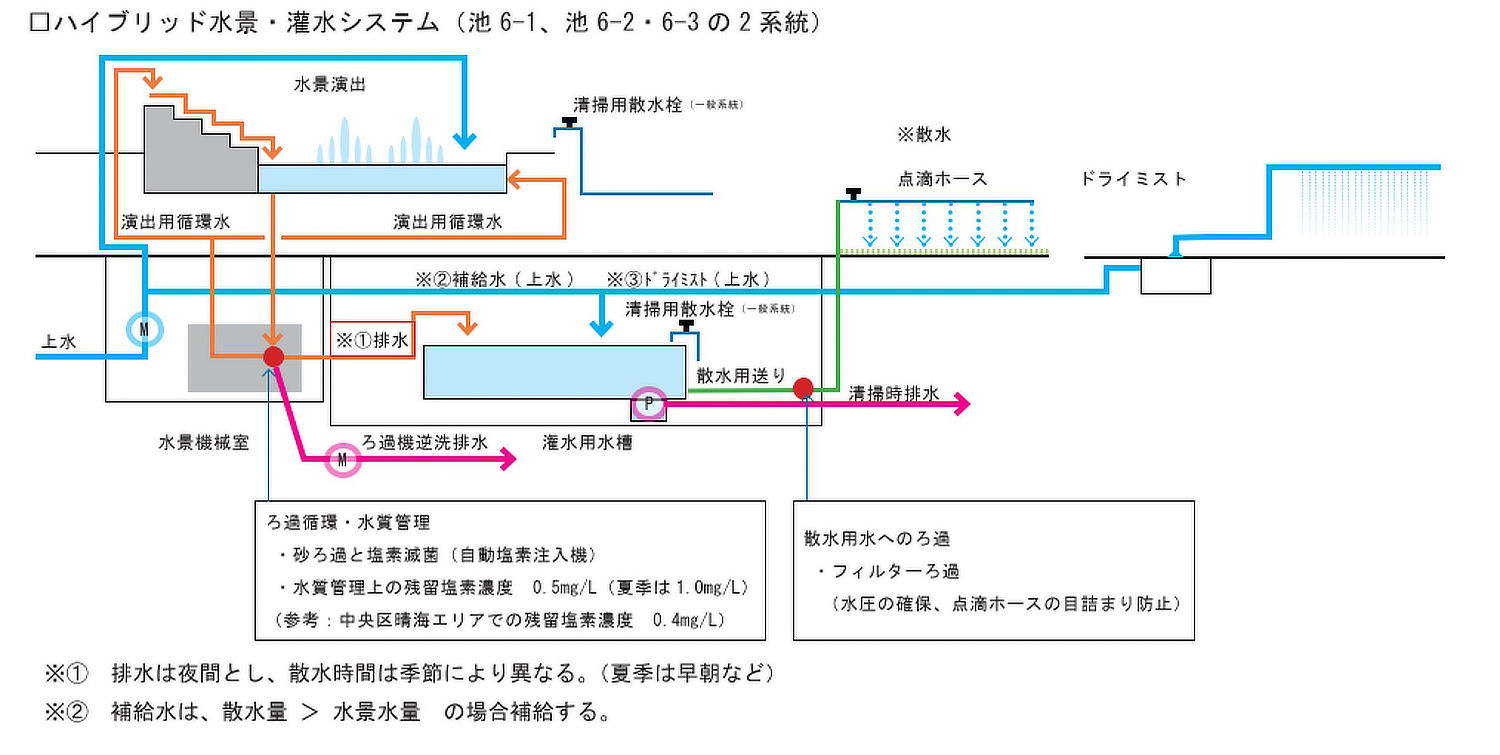 人工地盤部(建築躯体上部)の緑地の1回当たりの灌水量と水景保有水量が極力同量となるように水景をデザインすることで、水景の水質維持・上水使用量と水景メンテナンス費の低減を可能にした。