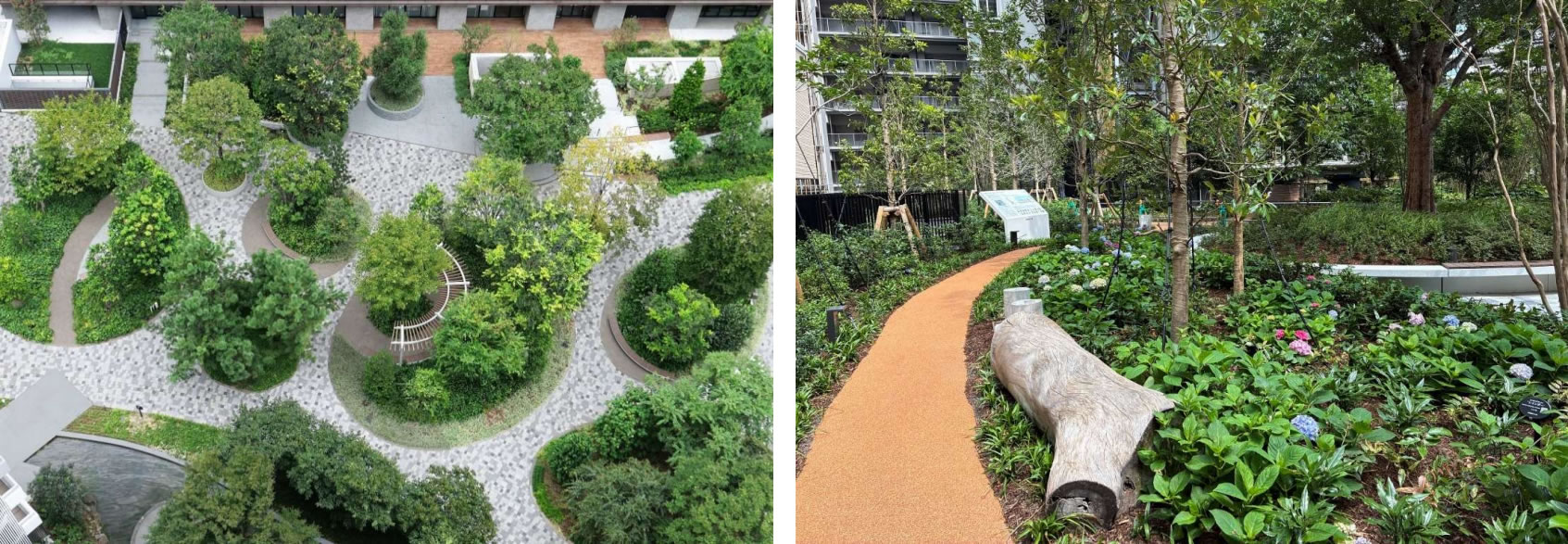 (左)建築躯体上部に「島風」をデザインテーマにマウンドによる緑の島を設け、奥行き感のあるオープンスペースを創出。(右)生物多様性の重点整備エリア。散策の小径沿いには、既存樹を再利用したベンチ、スツール、バードバスを配置。