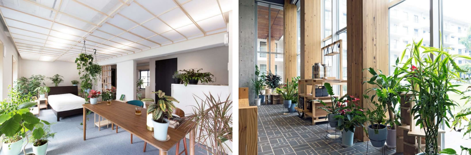 (上)URまちとくらしのミュージアムにおいて、文化財指定を受けた保存住棟(ラボ41)の一室を借り受け、緑化モデルルームを整備した。イベント時などに案内することで、緑につつまれた生活を体験できるだけでなく、自宅に置いた際の植物のサイズ感が想像できないという、購入時の大きな悩みの解決につながった。(下左)部屋の各部は生活のシーンをイメージさせる設え。(下右)ミュージアムエントランスにも緑があふれる光景が広がる。