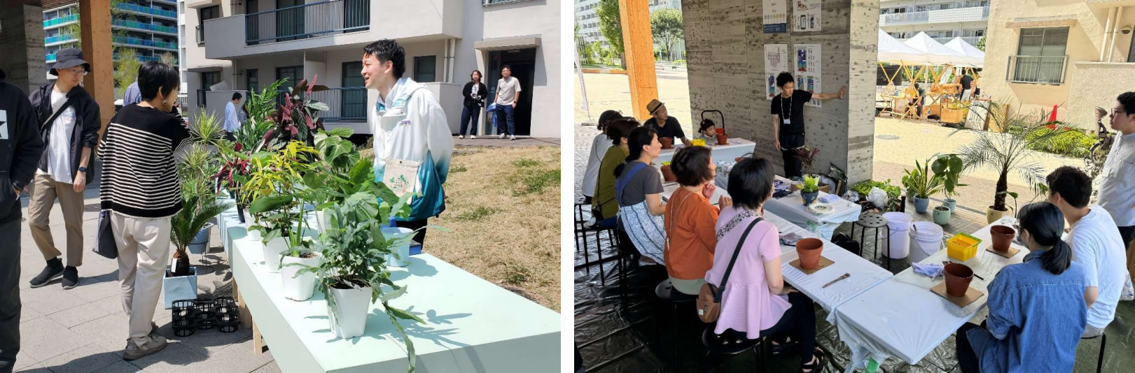 植物選びのサポートとなるように、現地での販売会やワークショップを実施している。(上):現地販売会全景。2025年度より、年4回開催予定。植木鉢の色と合わせたテーブルを製作して、展示台とすることにより、視覚的に各植物に必要な光の量がわかる。(下左)現地販売会接客風景。(下右)ワークショップ風景。子どもを中心とした植木鉢の塗装と植え替え体験のワークショップ。多くの方々に緑を育てるきっかけを得ていただくことを目標に活動を展開している。