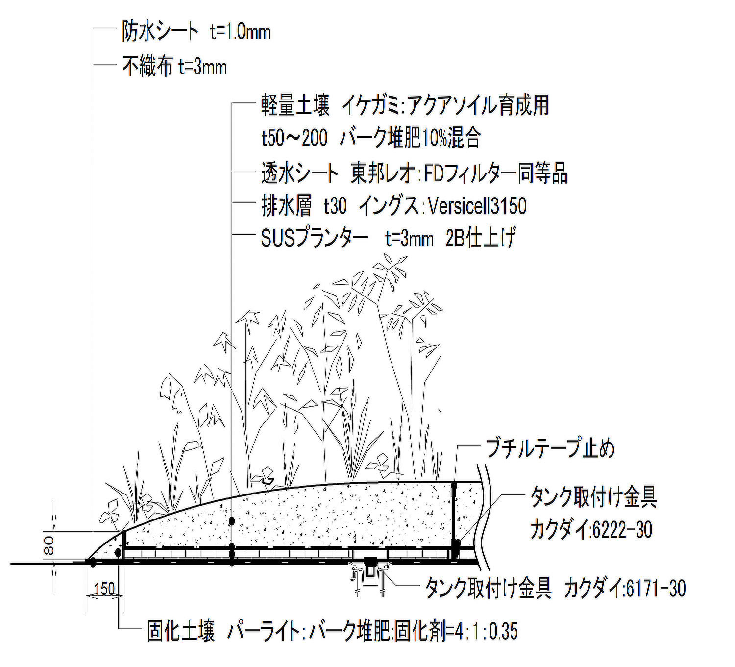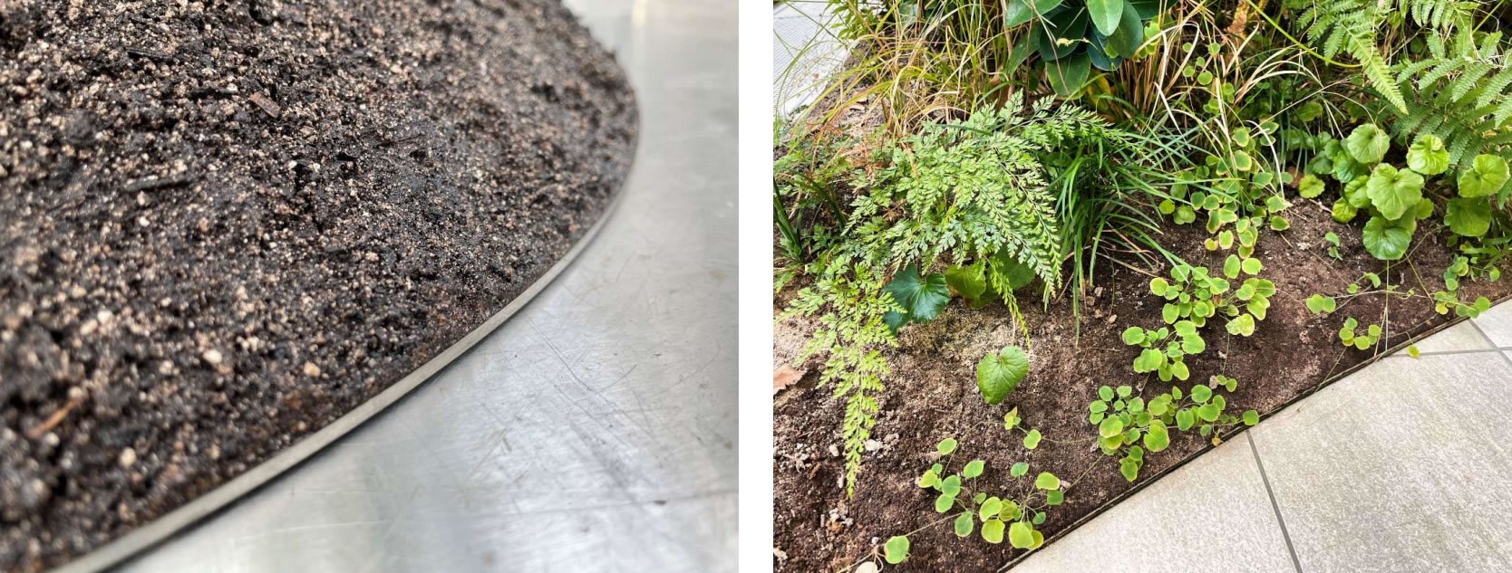 (右)固化土壌の表面。プランター外周部をアクリル系樹脂で固化した土壌で覆うことで、土壌の質感を再現し、プランターの露出を極力削減。中山式高度計で測定した固化土壌の硬度は30以上を確保し、メンテナンス時の踏み付けに耐える堅牢性を実現。(左)固化土壌の植物による被覆の様子。固化土壌の表面に適度な間隔をつくることで、外周部の固化土壌についても、植物根の定着により、プランター全体が植物に覆われる構造になっている。