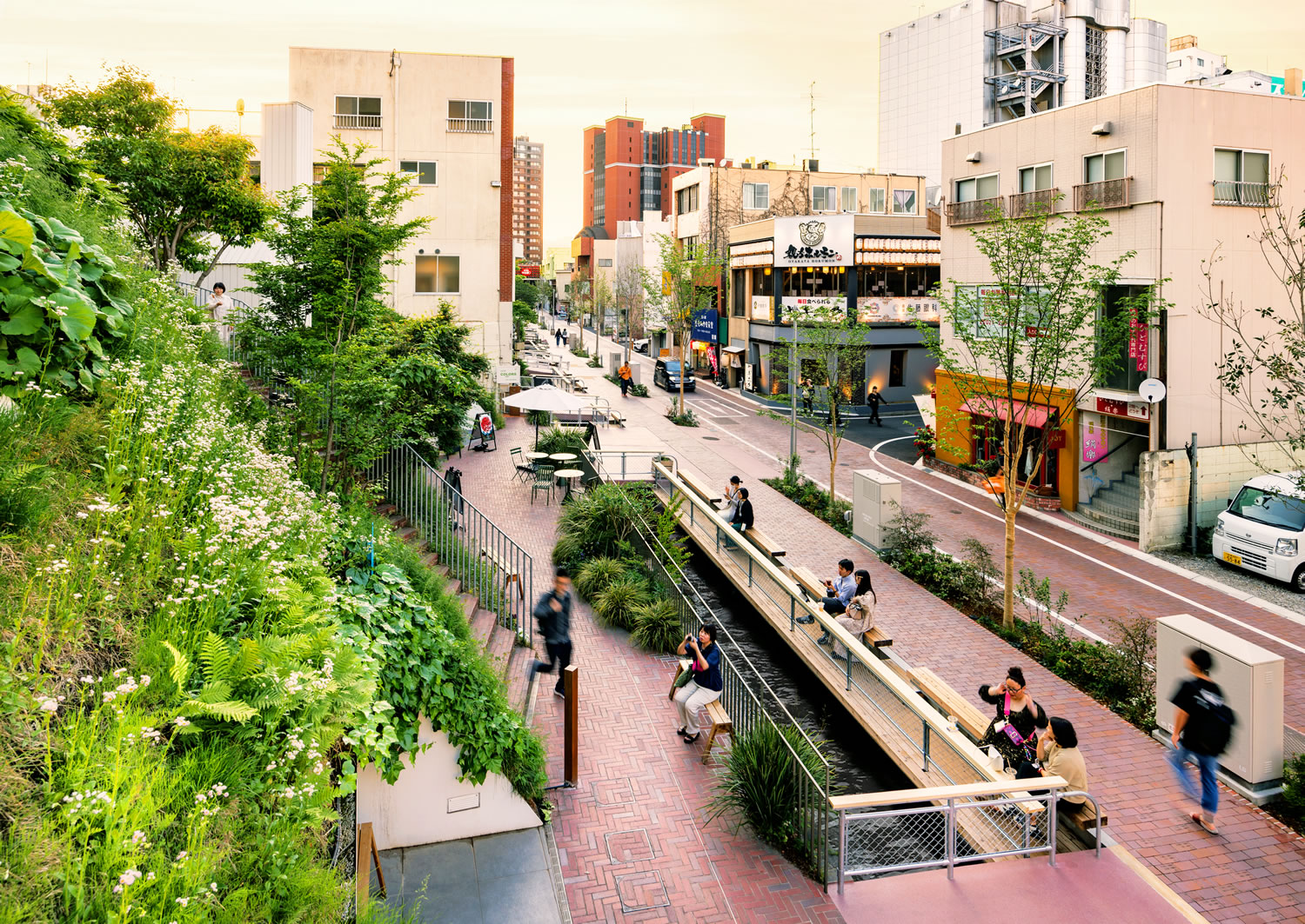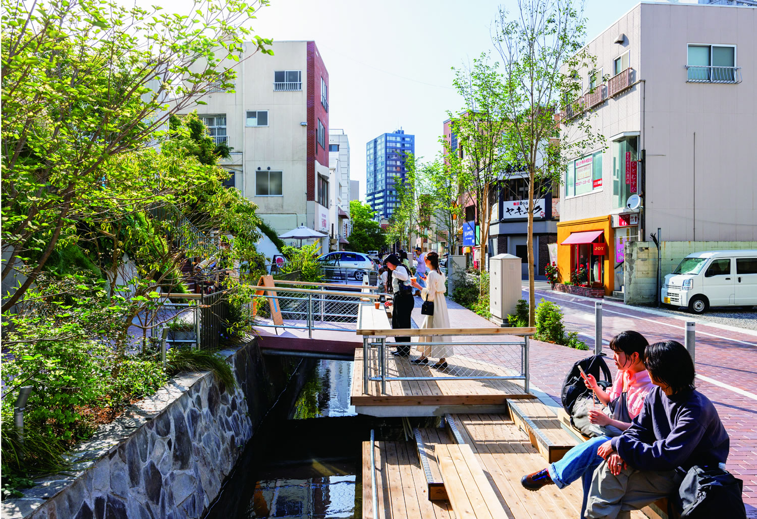 中心市街地のまちづくり指針「前橋市アーバンデザイン」に基づいて、地元有志の寄付金によって公共空間の民間整備と住民自治的管理を実現。かつて生糸で栄えた市街地に張り巡らされた水路を豊かな緑とともにまちの環境装置と捉え直し、ウォーカブルなまちとして再生した。 | |