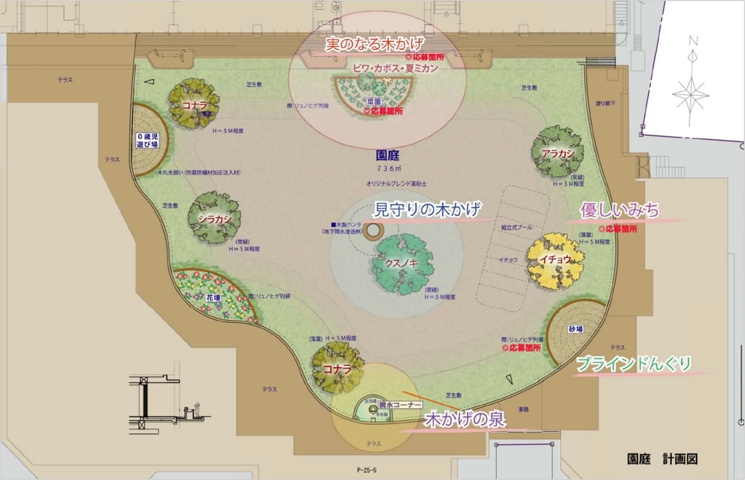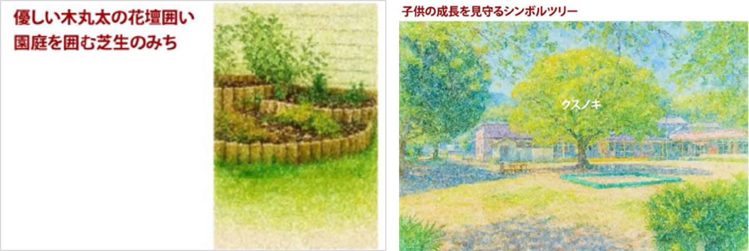 園庭を果樹や落葉樹で緑化し、併設するカフェの開放を通じて誰もが集えるコミュニティスポットを創出するプランです。植栽の工夫で、役割を持つコーナーを作り(実のなる木かげ、見守りの木かげ、木かげの泉など)、コーナーごとの自然体験で学びが育める場とします。また、カフェを利用する地域住民に園庭を解放することで、地域との繋がりを深めコミュニティ活性化につなげる点も評価されました。 |