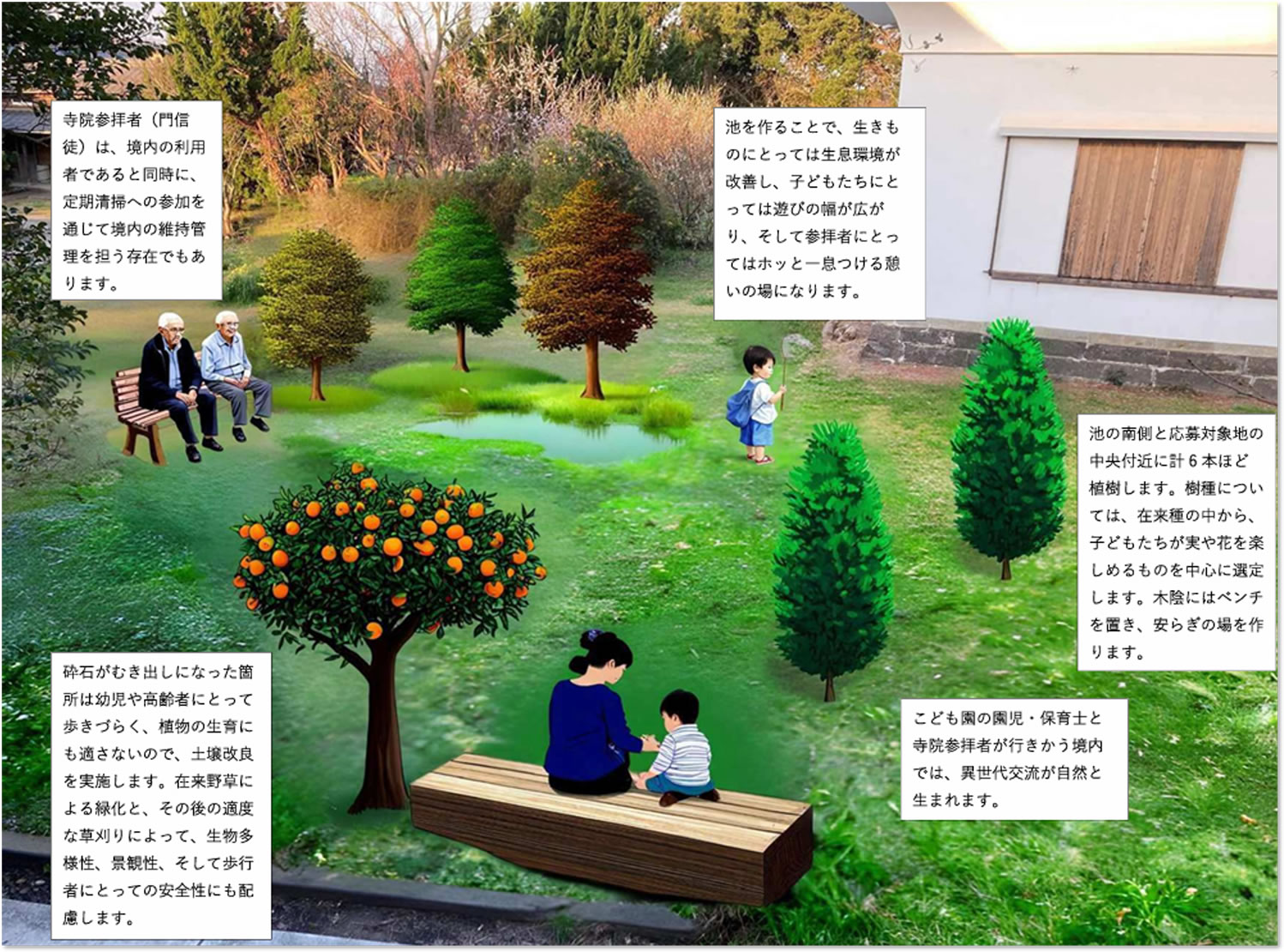 境内にある空き地を、在来種の植栽やビオトープ池で再生し、地域住民や園児に憩いと学びの場を提供するプランです。砕石地の土壌改良と在来種の植栽により、生物多様性を育むビオトープガーデンを創出。準絶滅危惧種の水生生物の生息環境回復にも寄与するガーデンを通じて、自然と触れ合いながら世代間交流を促す取り組みが評価されました。 |
